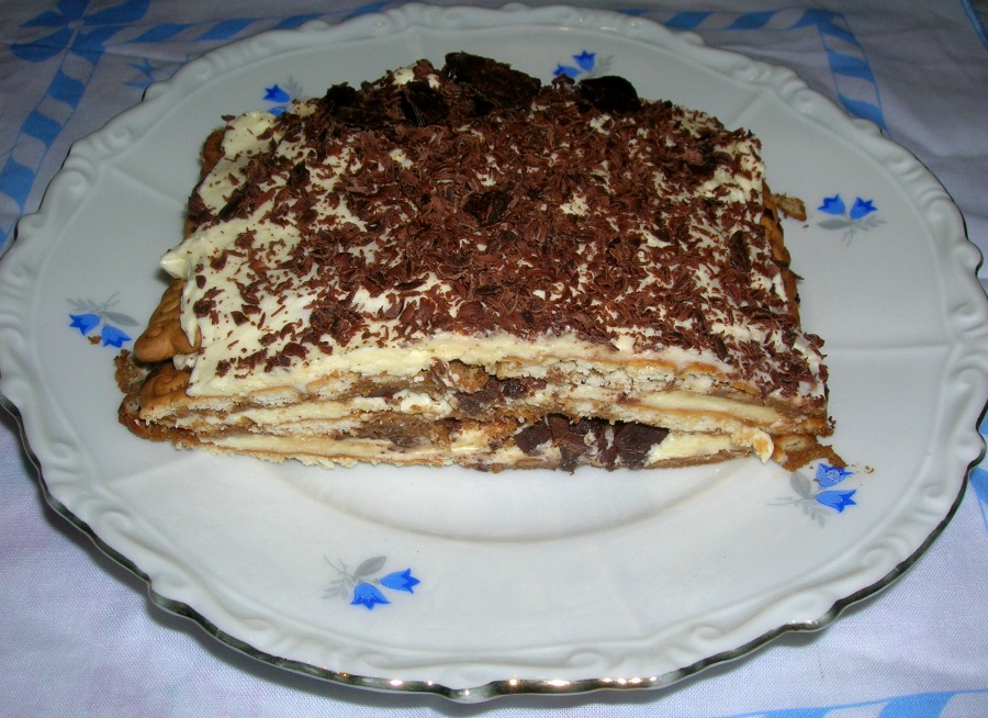 Montate il burro lasciato ammorbidire a temperatura ambiente, poi unite il tuorlo dell’uovo sbattuto con lo zucchero ed infine l’albume montato a neve con un pizzico di sale. Inzuppate velocemente i biscotti nel caffè e formate uno strato in un vassoio, stendetevi la crema al burro e il cioccolato fondente a scaglie. Fate così tre strati, terminate con la crema di burro e decorate con del cioccolato grattugiato. Mettete in frigo e servite fredda!