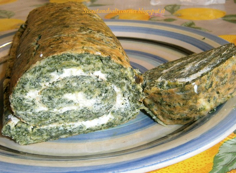 Lavate e lessate gli spinaci in acqua salata, poi sminuzzateli (io ho usato quelli surgelati già tritati!). In una pentola mescolate burro, farina e latte come per fare la besciamella (deve venire una crema molto soda) quindi unitevi gli spinaci, il sale, il pepe e la noce moscata. Aggiungete i rossi d’uovo e amalgamate bene il tutto. Montate gli albumi a neve ed incorporateli al composto. Foderate una placca da forno con la carta da forno e rovesciatevi l’impasto. A questo punto mettete in forno a 180°. Infine arrotolate il “salame” su se stesso con la carta da forno e poi avvolgete il tutto in un panno umido. Quando si sarà freddato risvolgete il rotolo e spalmateci la ricotta! Servitelo a fette!
