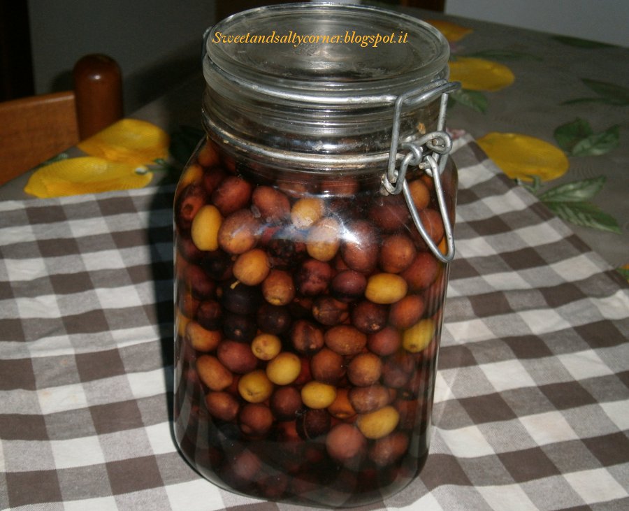 Mettete le olive nere in un barattolo con la bocca abbastanza larga da permettere di mescolare le olive con un mestolino e riempite con acqua salata. Dopo qualche giorno cambiate l’acqua e riempite di nuovo. Lasciate riposare per 3 o 4 mesi!