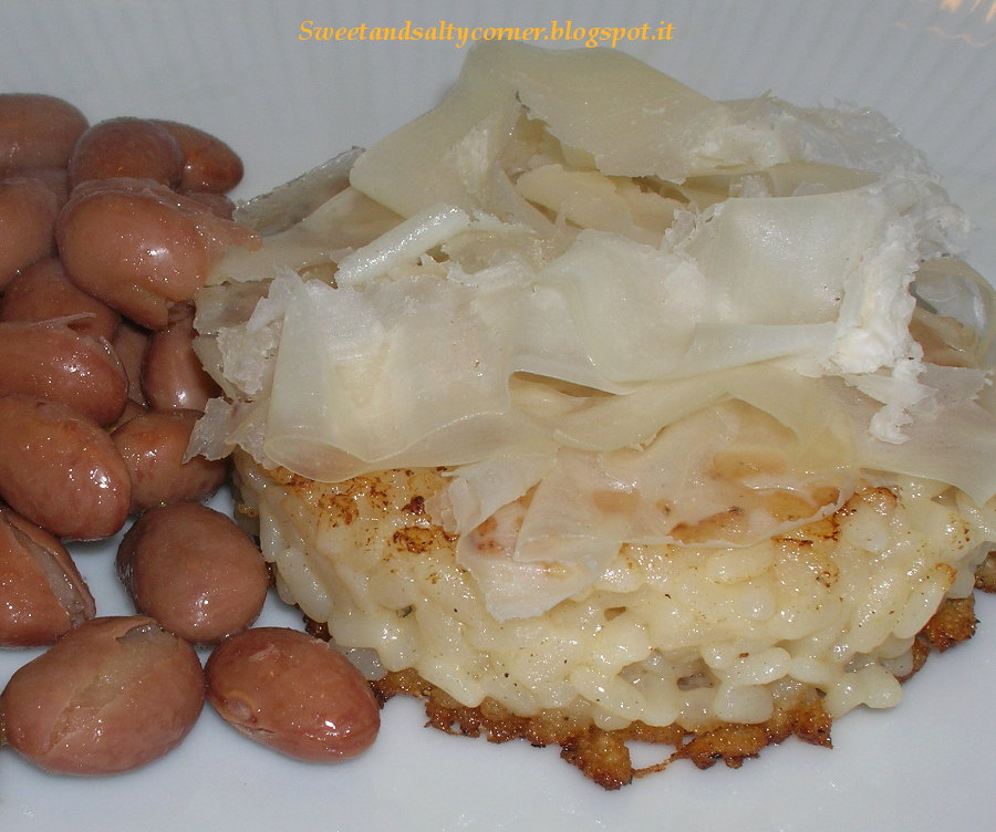Ho fatto fondere il burro in una pentola, poi ho aggiunto il riso e fatto tostare. Ho sfumato con il vino e fatto cuocere aggiungendo via via del brodo. Ho insaporito con pepe nero e noce moscata, poi ho terminato la cottura. Ho lasciato intiepidire per circa 5 minuti e poi ho versato qualche cucchiaiata di riso in un coppapasta. Ho pressato il riso e l’ho sformato in una padella dove avevo giĆ scaldato un filo d’olio. Ho fatto cuocere l’hamburger di riso fino a farlo dorare! L’ho servito con abbondante formaggio Raspadura!
