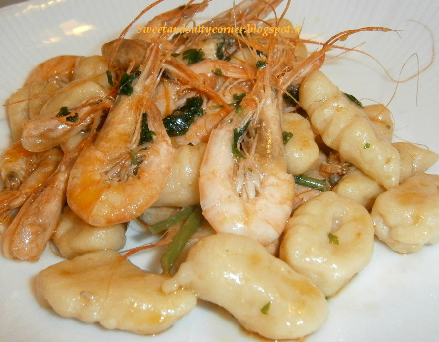 Ho lavato bene i gamberetti e li ho fatti cuocere in una padella con olio e peperoncino per pochi minuti. Ho aggiustato di sale e intanto ho cotto gli gnocchi di farina di ceci in acqua bollente salata (a cui ho aggiunto un filo d’olio per non farli appiccicare durante la cottura).