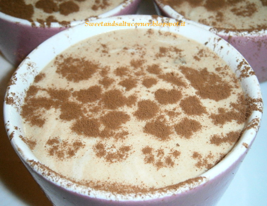Ho lasciato raffreddare la crema di caffè. Ho montato la panna e l’ho incorporata alla crema di caffè fredda. Ho suddiviso il composto nelle coppette e ho messo in freezer per un paio d’ore. Prima di servire le coppette al caffè le ho decorate con del cacao amaro in polvere.